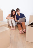 Młoda para za pomocą laptopa podczas ruchu w nowym mieszkaniu