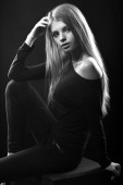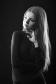 Studio monochromatyczny portret modnej młodej kobiety pozowanie z nagimi ramionami