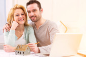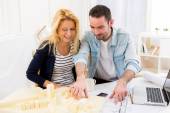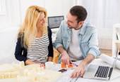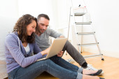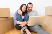 Młoda para za pomocą laptopa podczas ruchu w nowym mieszkaniu