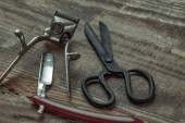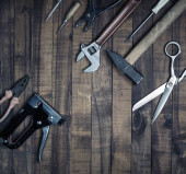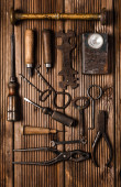 Używane narzędzia robocze na drewnianym tle. Widok góry. Układy płaskie.