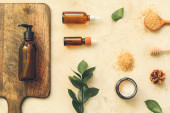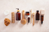 Skład z różnymi produktami kosmetycznymi i solą morską na jasnym tle