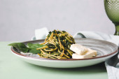 Woman preparing tasty green lasagna in kitchen, closeup