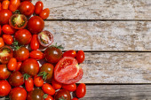 Czerwone dojrzałe pomidory tekstury tła. Różne cechy pomidorów na drewnianym stole. Czarne pomidory Solanum lycopersicum.