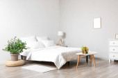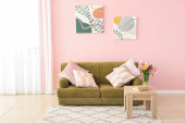 Interior of modern room with armchair and chest of drawers with protea flowers