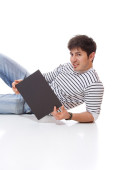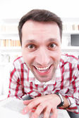 śmieszne z bliska obraz twarzy biznesmen w pracy, podczas gdy w despai