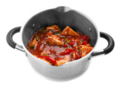 Zdjęcie "Wlać ocet i dodać posiekany czosnek. Zagotować mieszaninę przez kolejne 10 minut.." może być wykorzystywane do celów osobistych i komercyjnych zgodnie z warunkami zakupionej licencji Royalty-free. Obraz jest dostępny do pobrania w jakości wysokiej rozdzielczości do 5760x3840.