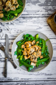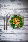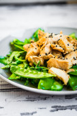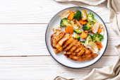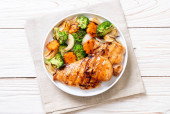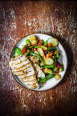 pieczonego kurczaka z pieczonymi warzywami na tle rustykalnym