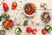 Świeże warzywa wpadające do stalowego garnka, izolowane na białym tle