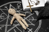 Voodoo lalka ze szpilkami otoczony przez przedmioty ceremonialne na czarnym stole, płaski leżak