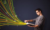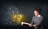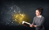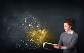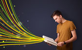 bardzo młoda kobieta, czytanie książki, podczas gdy kolorowe linie są comin