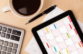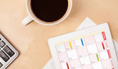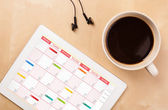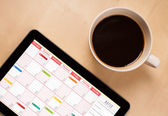 Tablet pc kalendarz wyświetlone na ekranie przy filiżance kawy na d