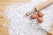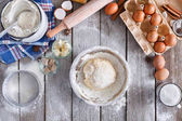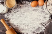 Przepis na domowe ciasto (jajka, mąka, mleko, cukier) i drewniane ciasto ugniatające na drewnianym stole, widok z góry