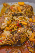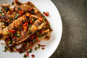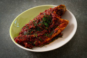 Makrela smażona (ikan sardin) gotowana z pikantnym sambalowym czerwonym chili i cebulą z cebulą jako dekoracją.