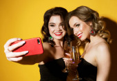dwie eleganckie młode kobiety w czarnych sukienkach koktajlowych pijące szampana i robiące selfie.