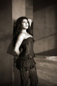 kobieta ubrana w czarny gorset i perły