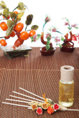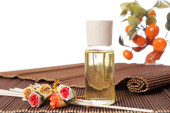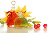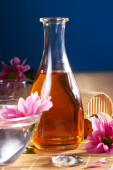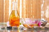 butelki z żółty olej i małe kwiaty położyć na brązowy mat. kamień drzewami w tle