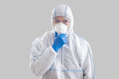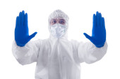 Pracownica służby zdrowia w kombinezonie ochronnym i rękawiczkach stojących na białym tle