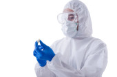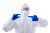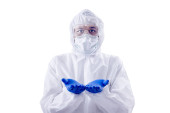 Pracownica służby zdrowia w kombinezonie ochronnym i rękawiczkach stojących na niebieskim tle