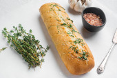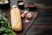 Chleb czosnkowy wypełniony złożony zestaw masła ziołowego, na starym ciemnym rustykalnym tle tabeli