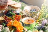 Zdjęcie "naturalna aromatyczna herbata owocowa w przezroczystym czajniku oraz w filiżance wśród jagód i kwiatów. ciepła herbata aromatyczna o głębokim aromacie jagód i dzikich kwiatów." może być wykorzystywane do celów osobistych i komercyjnych zgodnie z warunkami zakupionej licencji Royalty-free. Obraz jest dostępny do pobrania w jakości wysokiej rozdzielczości do 5760x3840.