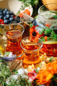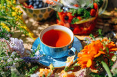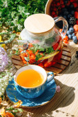 naturalna aromatyczna herbata owocowa w przezroczystym czajniku oraz w filiżance wśród jagód i kwiatów. ciepła herbata aromatyczna o głębokim aromacie jagód i dzikich kwiatów.
