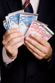 Szczegóły ręce człowieka z pieniędzy, banknotów euro