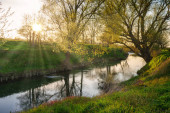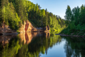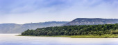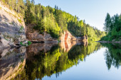 Zdjęcie "Kamienna ściana skalna nad wodą, za nią zielone drzewa." może być wykorzystywane do celów osobistych i komercyjnych zgodnie z warunkami zakupionej licencji Royalty-free. Obraz jest dostępny do pobrania w jakości wysokiej rozdzielczości do 5760x3840.