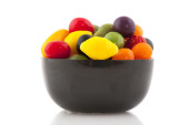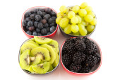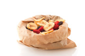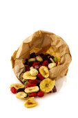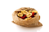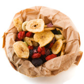 różne suszone owoce w brązową papierową torbę na białym tle nad białym