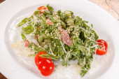 Sałatka z rukoli z pomidorami, oliwkami i parmezanem