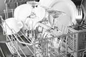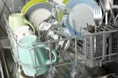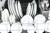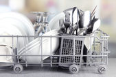 czyste naczynia, suszarka na naczynia metalowe szafy na jasnym tle