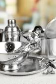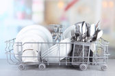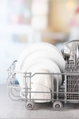 czyste naczynia, suszarka na naczynia metalowe szafy na jasnym tle