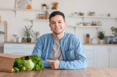 Młody człowiek i torba papierowa ze świeżymi warzywami na białym tle