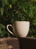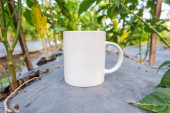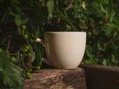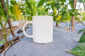Biała porcelana herbata filiżanka makieta na drewnianym balkonie z zielonymi dzikimi winogron kraju stylu. Szablon kubek ciepły zdrowy napój. Gorący, warzony naturalny napój. Przytulny słodki dom weekend rano śniadanie domek