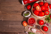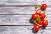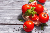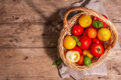 Dojrzałe czerwone pomidory ze świeżą bazylią. Nowe warzywa w wiklinowym koszu. Vintage drewniany stół, widok z góry