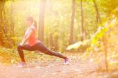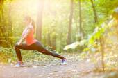 Urocza kobieta w stroju sportowym squatting w parku