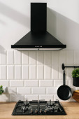Zdjęcie "czarny kaptur na tle kuchni, białe płytki i ściany z czerwonej cegły" może być wykorzystywane do celów osobistych i komercyjnych zgodnie z warunkami zakupionej licencji Royalty-free. Obraz jest dostępny do pobrania w jakości wysokiej rozdzielczości do 5760x3840.
