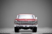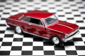 Izmir, Turcja - 13 kwietnia 2021: Widok z przodu czerwonego mercedesa Benz 220 Marka zabawka model samochód na białym tle.