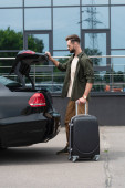 Uśmiechnięty biznesmen z walizką stojący obok budynku