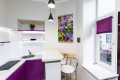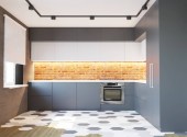 Nowoczesna kuchnia na poddaszu z żółtymi drzwiami wewnętrznymi