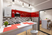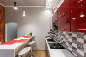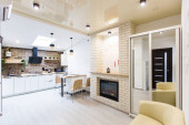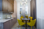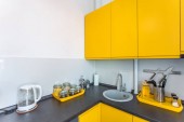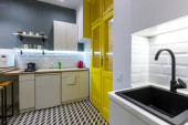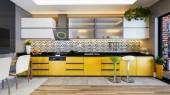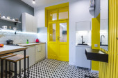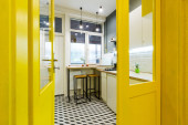 Zdjęcie "Nowoczesna kuchnia na poddaszu z żółtymi drzwiami wewnętrznymi" może być wykorzystywane do celów osobistych i komercyjnych zgodnie z warunkami zakupionej licencji Royalty-free. Obraz jest dostępny do pobrania w jakości wysokiej rozdzielczości do 5760x3840.