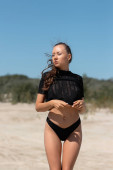 Pełne ciało zmysłowej młodej szczupłej modelki w stylowej czarnej bieliźnie klęczącej i trzymającej ręce na głowie podczas relaksu na piaszczystej plaży