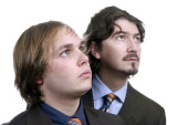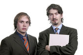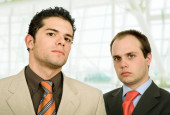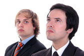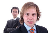 Two young business men portrait on white. focus on the right man