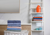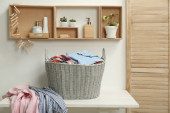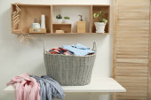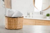 Wiklinowy kosz z brudnym praniem na drewnianym stole w łazience
