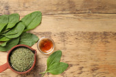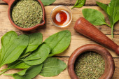 Zdjęcie "Świeże i suszone liście bananowca z olejkiem eterycznym na drewnianym stole, płaskie układanki" może być wykorzystywane do celów osobistych i komercyjnych zgodnie z warunkami zakupionej licencji Royalty-free. Obraz jest dostępny do pobrania w jakości wysokiej rozdzielczości do 5760x3840.