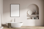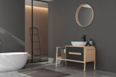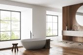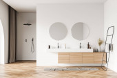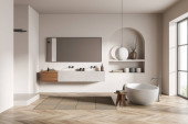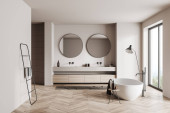 Zdjęcie "Wnętrze z oryginalną próżnością, umywalką, dwoma lustrami, wanną, poręczą, drewnianą podłogą, łukowym oknem, białymi ścianami, szarymi beżowymi zasłonami i dywanem. Koncepcja nowoczesnego designu. 3d renderowanie" może być wykorzystywane do celów osobistych i komercyjnych zgodnie z warunkami zakupionej licencji Royalty-free. Obraz jest dostępny do pobrania w jakości wysokiej rozdzielczości do 5760x3840.