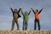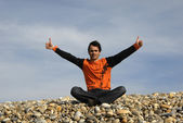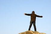 człowiek z ramionami szeroko otwarte na plaży