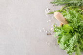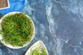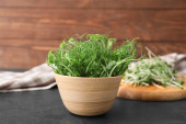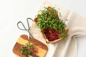 Drewniane pudełko z różnym świeżym mikrozielonym na jasnym tle