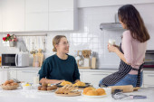 Pieczenie ciastek i ciasteczek to niezła zabawa. W kuchni młoda kobieta trzyma pyszny świeży chleb..