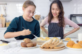 Zdjęcie "Pieczenie ciastek i ciasteczek to niezła zabawa. W kuchni młoda kobieta trzyma pyszny świeży chleb.." może być wykorzystywane do celów osobistych i komercyjnych zgodnie z warunkami zakupionej licencji Royalty-free. Obraz jest dostępny do pobrania w jakości wysokiej rozdzielczości do 5760x3840.