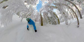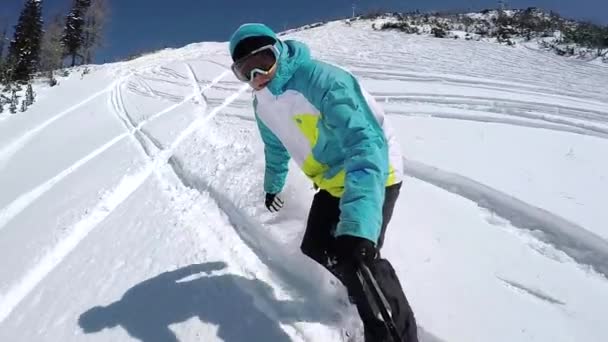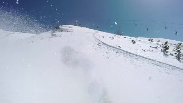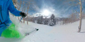 ZAMKNIJ: Mężczyzna narciarz strzępy świeży proszek podczas jazdy na nartach drzewa w Park City.